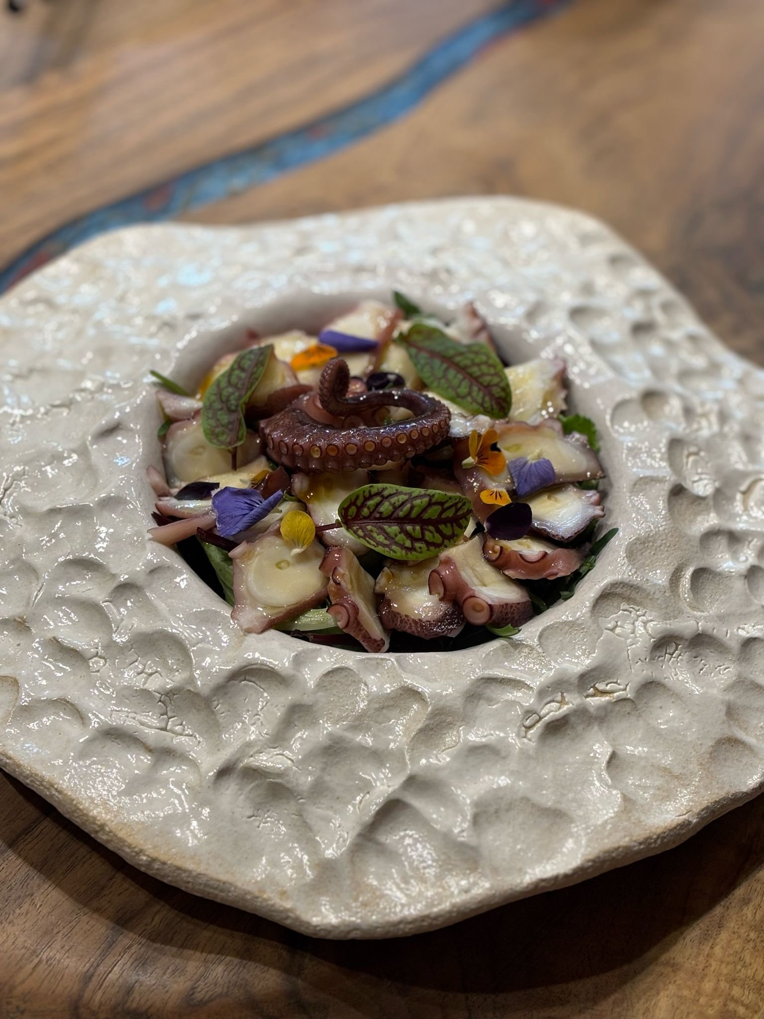 Sashimi de caracatita, salata verde, suc de yuzu, ulei de trufe, ulei infuzat cu patrunjel // Octopus sashimi, green salad, yuzu juice, truffle oil, basil infused oil