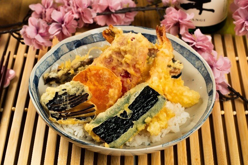 Anghila, crevete, legume prajite in stil tempura, orez, sos tempura // Eel, prawns, vegetables fried in tempura style, rice , tempura sauce